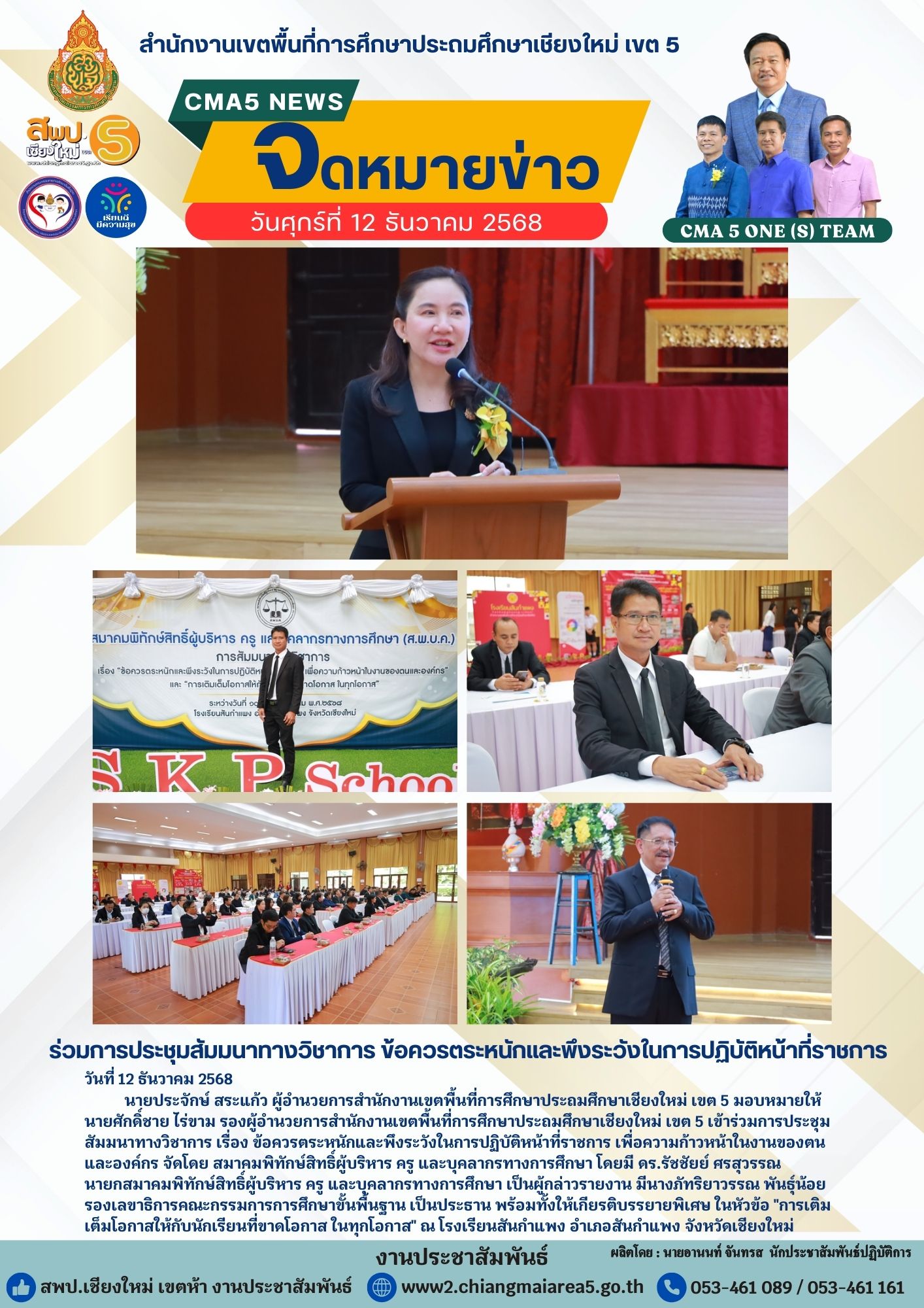 วันที่ 8 ธันวาคม 2568 นายประจักษ์ สระแก้ว ผู้อำนวยการสำนักงานเขตพื้นที่การศึกษาประถมศึกษาเชียงใหม่ เขต 5 มอบหมายให้ นางส...