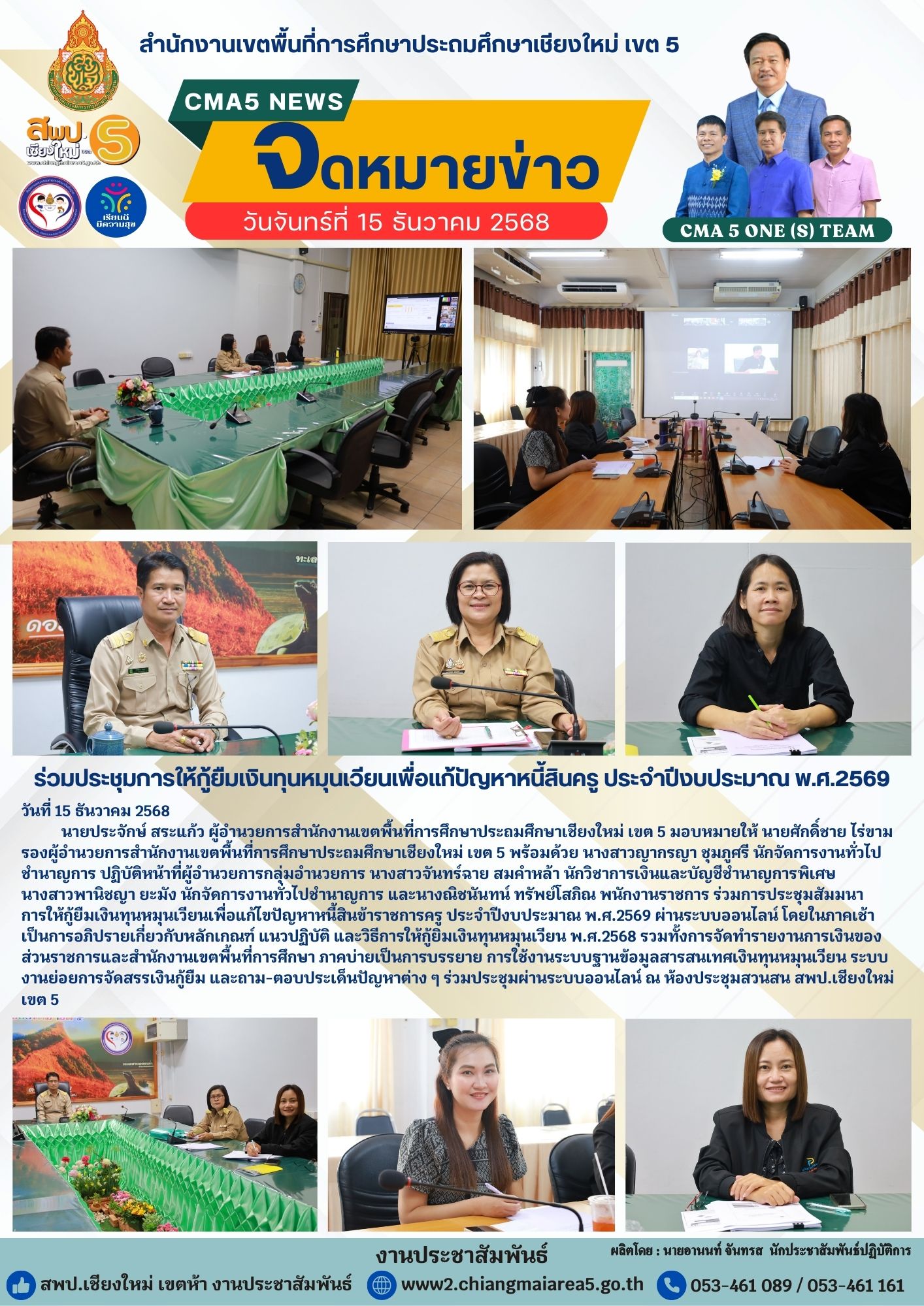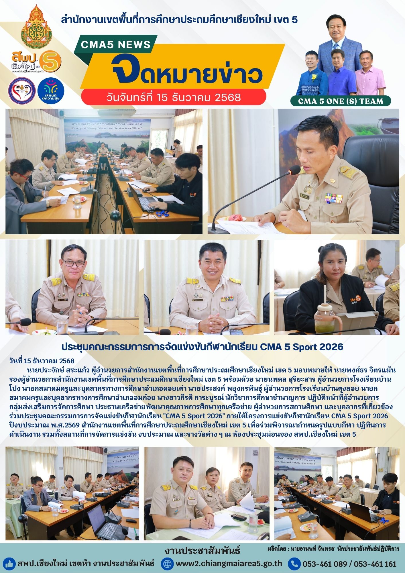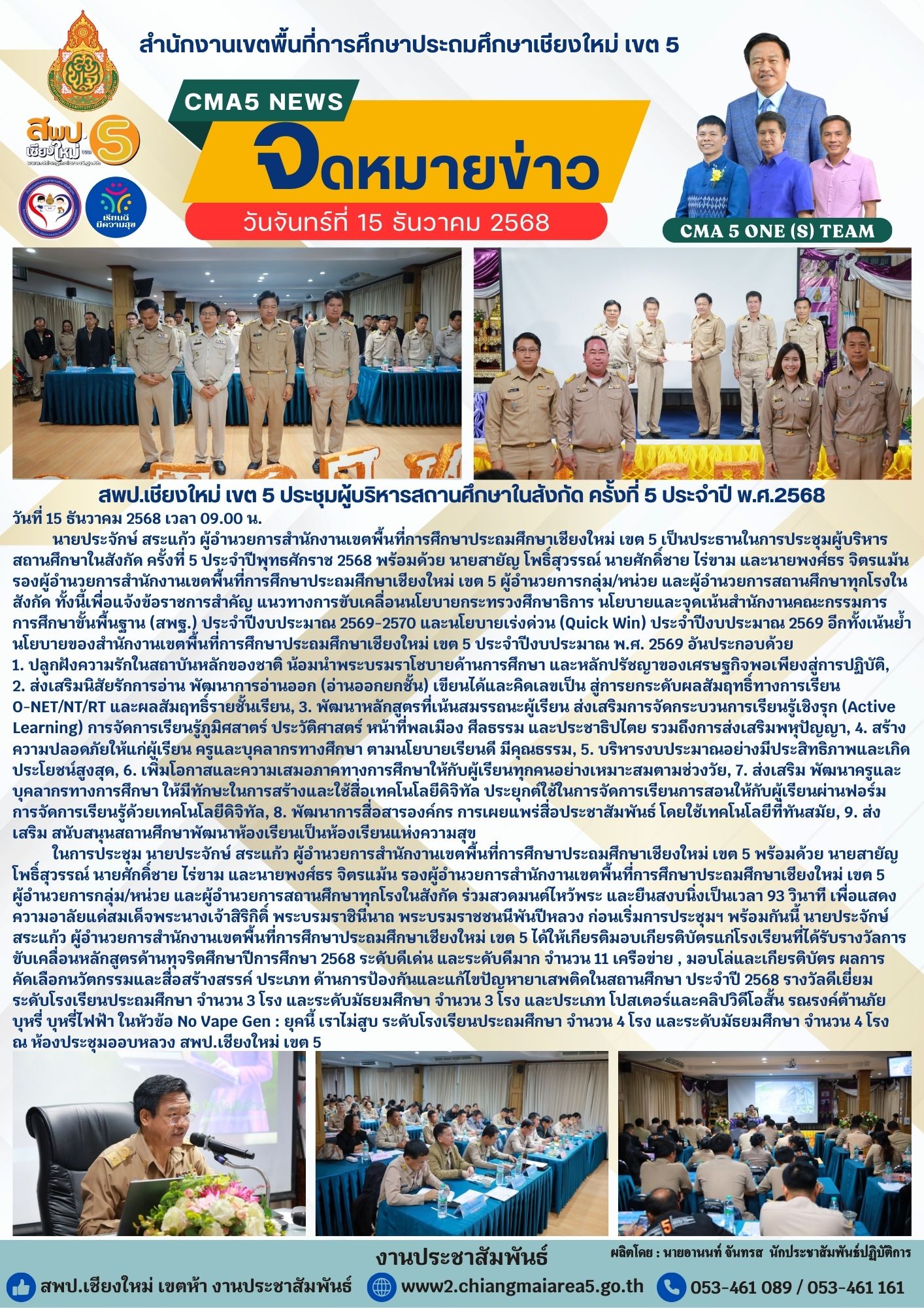 วันที่ 15 ธันวาคม 2568 เวลา 09.00 น. นายประจักษ์ สระแก้ว ผู้อำนวยการสำนักงานเขตพื้นที่การศึกษาประถมศึกษาเชียงใหม่ เขต 5...