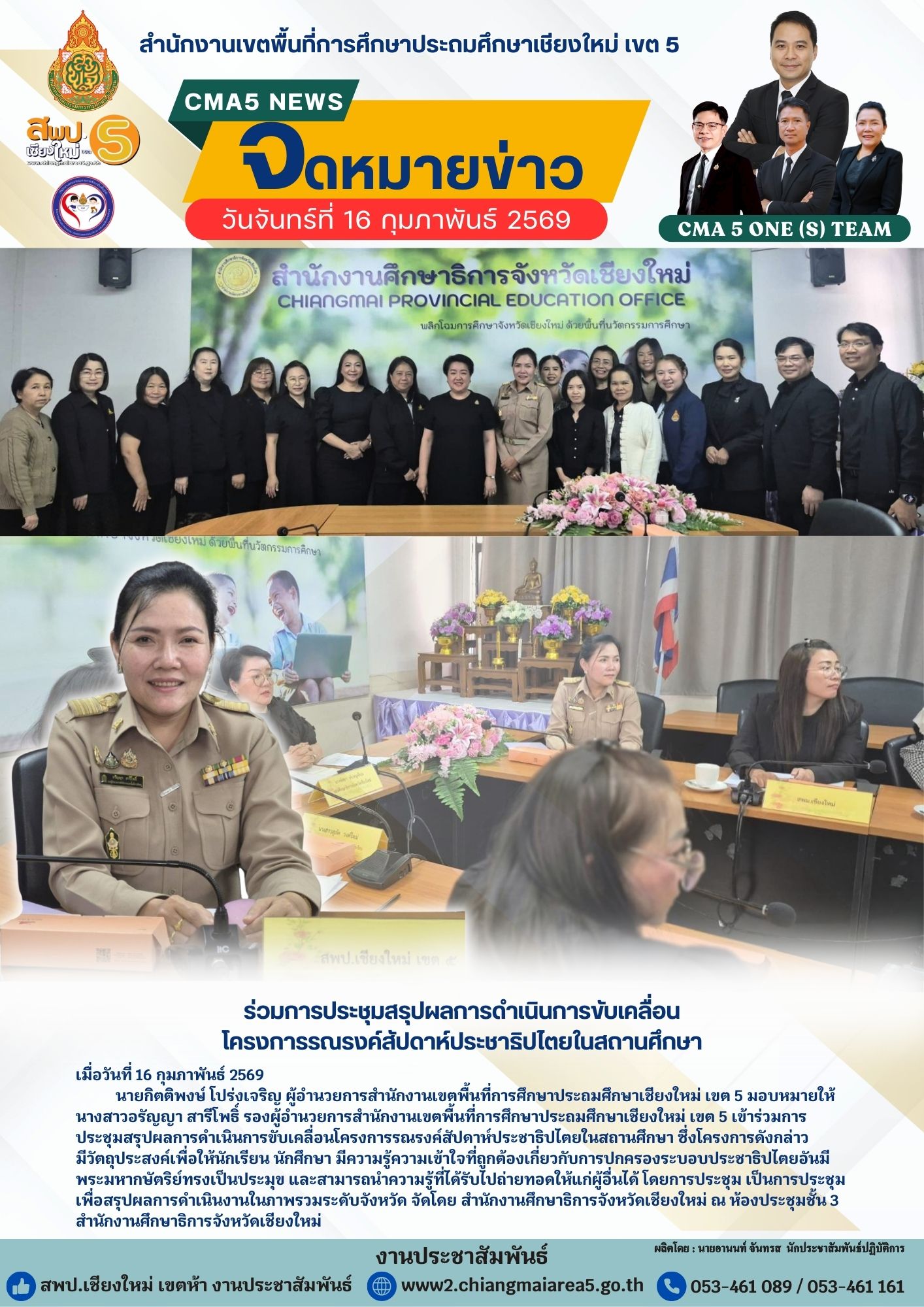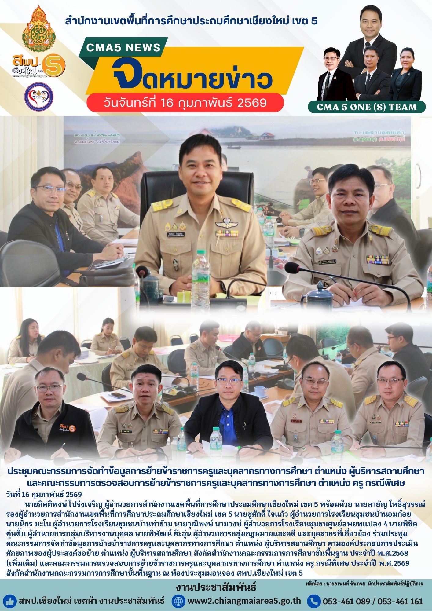 เมื่อวันที่ 16 กุมภาพันธ์ 2569 นายกิตติพงษ์ โปร่งเจริญ ผู้อำนวยการสำนักงานเขตพื้นที่การศึกษาประถมศึกษาเชียงใหม่ เขต 5 มอ...