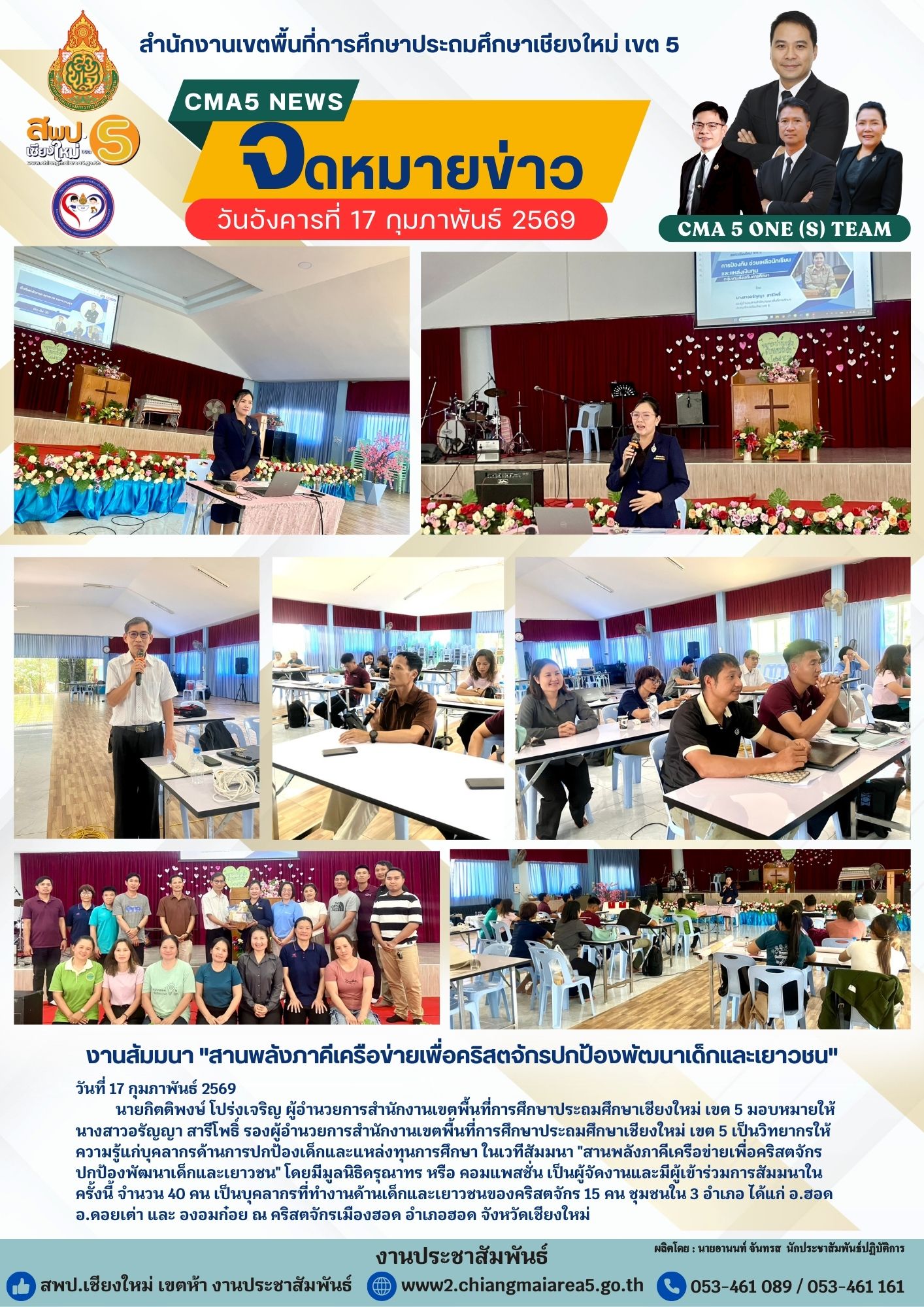 วันที่ 17 กุมภาพันธ์ 2569 นายกิตติพงษ์ โปร่งเจริญ ผู้อำนวยการสำนักงานเขตพื้นที่การศึกษาประถมศึกษาเชียงใหม่ เขต 5 มอบหมาย...