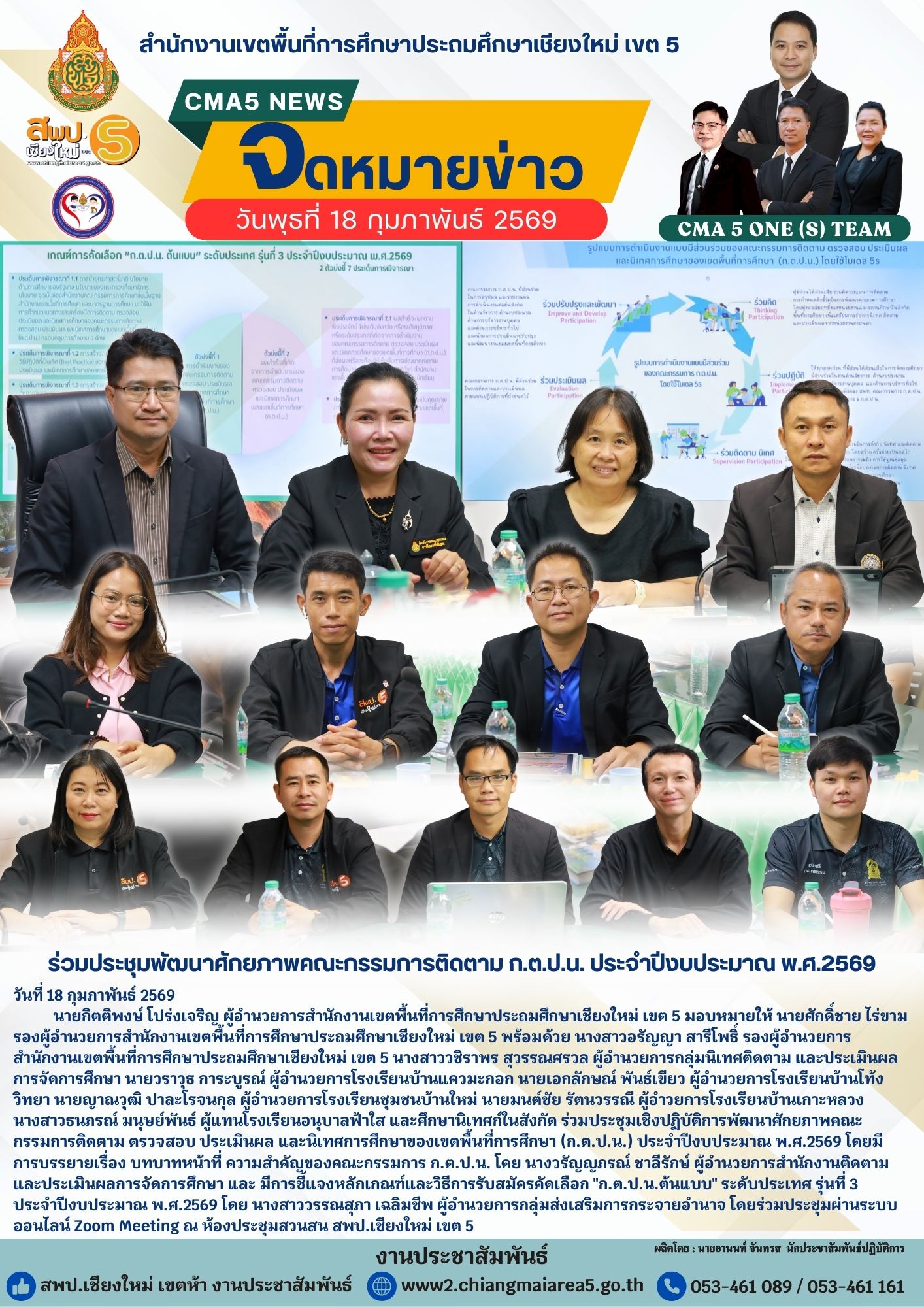 วันที่ 17 กุมภาพันธ์ 2569 นายกิตติพงษ์ โปร่งเจริญ ผู้อำนวยการสำนักงานเขตพื้นที่การศึกษาประถมศึกษาเชียงใหม่ เขต 5 ประธานค...