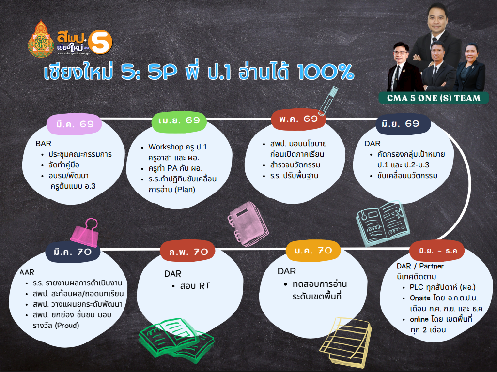 วันที่ 2 มีนาคม 2569 นายกิตติพงษ์ โปร่งเจริญ ผู้อำนวยการสำนักงานเขตพื้นที่การศึกษาประถมศึกษาเชียงใหม่ เขต 5 พร้อมด้วย นายสายัญ โพธิ์สุวรรณ์ รองผู้อำนวยการสำนักงานเขตพื้นที่การศึกษาประถมศึกษาเชียงใหม่ เขต 5 และนางสาววชิราพร สุวรรณศรวล ผู้อำนวยการกลุ่มนิเทศติดตาม และประเมินผลการจัดการศึกษา ร่วมประชุมขับเคลื่อนการอ่าน "เชียงใหม่ 5 : 5P พี่ป.1 อ่านได้ 100%" โดยใช้โมเดล CMA5 5P ในการขับเคลื่อน ได้แก่ Plan, PLC, PA, Partner, Proud ณ ห้องประชุมม่อนจอง สพป.เชียงใหม่ เขต 5