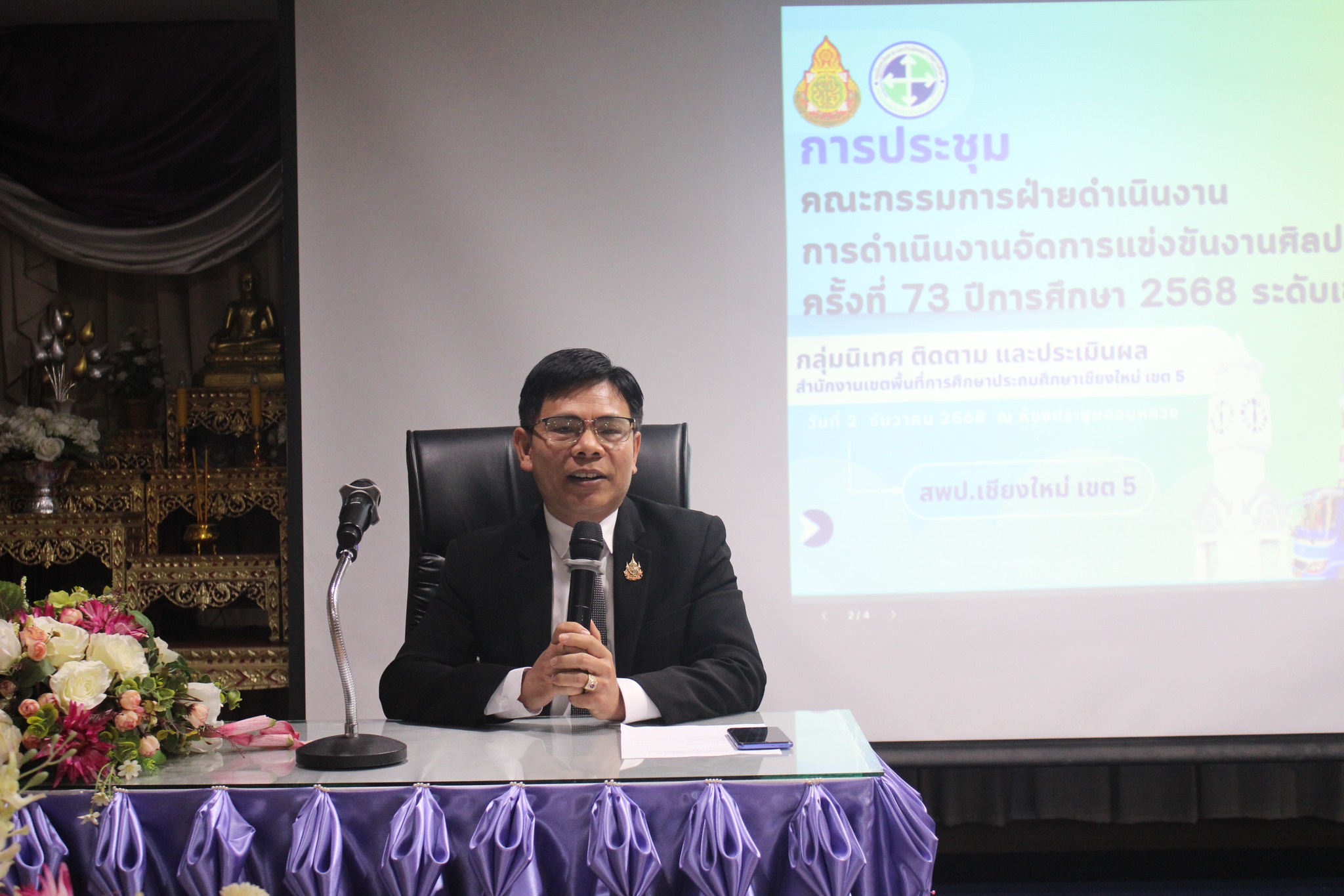 วันที่ 2 ธันวาคม 2568 นายประจักษ์ สระแก้ว ผู้อำนวยการสำนักงานเขตพื้นที่การศึกษาประถมศึกษาเชียงใหม่ เขต 5 มอบหมายให้ นายสายัญ โพธิ์สุวรรณ์ รองผู้อำนวยการสำนักงานเขตพื้นที่การศึกษาประถมศึกษาเชียงใหม่ เขต 5 เป็นประธาน พร้อมด้วย ผู้อำนวยการสถานศึกษา ศึกษานิเทศก์ ครูและบุคลากรทางการศึกษาที่เกี่ยวข้อง ร่วมประชุมคณะกรรมการฝ่ายดำเนินงาน การดำเนินงานจัดการแข่งขันงานศิลปหัตถกรรมนักเรียน ครั้งที่ 73 ปีการศึกษา 2568 ระดับเขตพื้นที่การศึกษา ณ ห้องประชุมออบหลวง สพป.เชียงใหม่ เขต 5