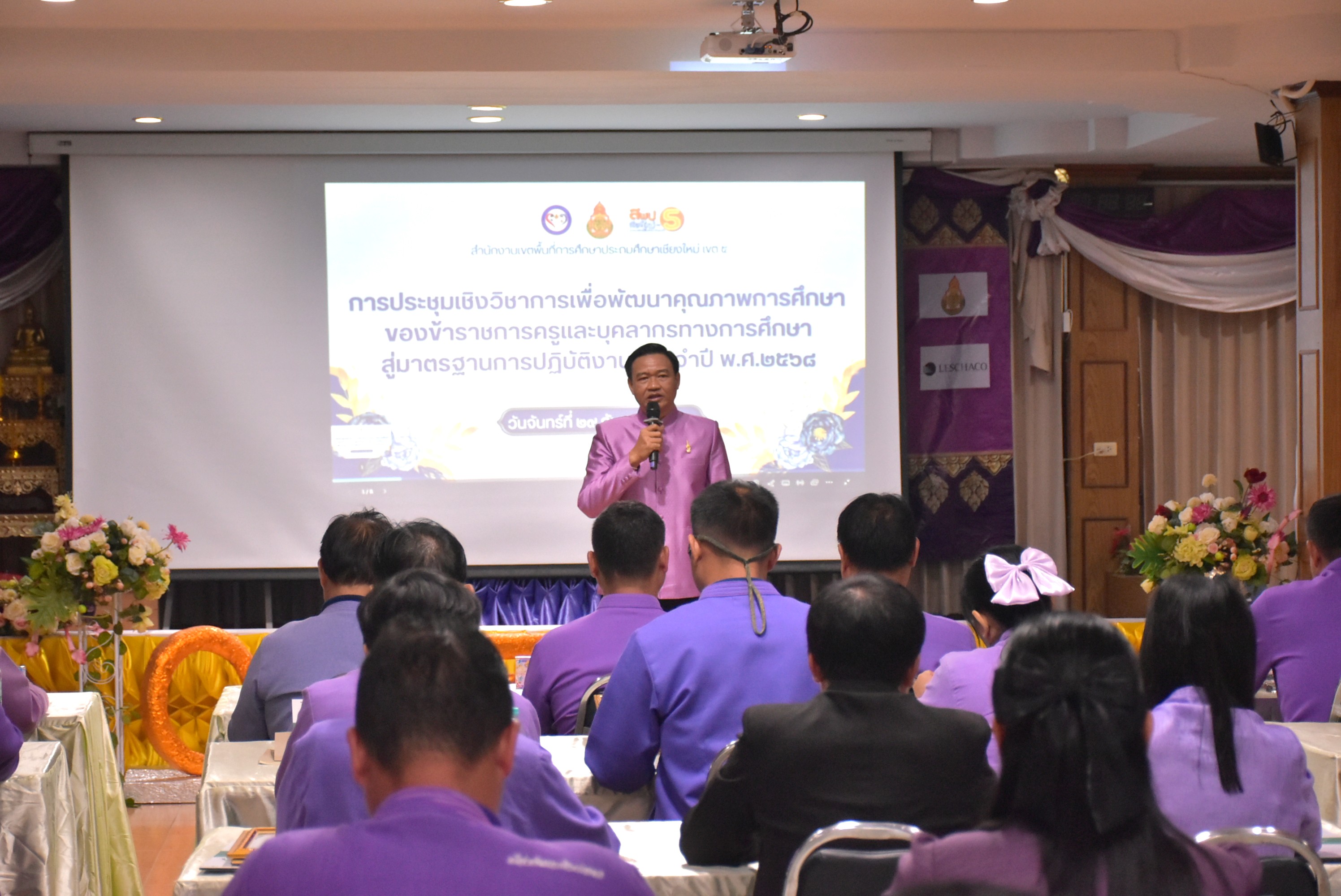 วันที่ 29 กันยายน 2568 นายประจักษ์ สระแก้ว ผู้อำนวยการสำนักงานเขตพื้นที่การศึกษาประถมศึกษาเชียงใหม่ เขต 5 เป็นประธาน พร้อมด้วย นายสายัญ โพธิ์สุวรรณ์ นายศักดิ์ชาย ไร่ขาม และนายพงศ์ธร จิตรแม้น รองผู้อำนวยการสำนักงานเขตพื้นที่การศึกษาประถมศึกษาเชียงใหม่ เขต 5 ผู้บริหารสถานศึกษาในสังกัด ผู้อำนวยการกลุ่มงาน ศึกษานิเทศก์ และบุคลากรที่เกี่ยวข้อง ร่วมการประชุมเชิงวิชาการเพื่อพัฒนาคุณภาพการศึกษาของข้าราชการครูและบุคลากรทางการศึกษา สู่มาตรฐานการปฏิบัติงาน ประจำปี พ.ศ.2568 โดยในการประชุม มีการบรรยายพิเศษจาก นายประจักษ์ สระแก้ว ผู้อำนวยการสำนักงานเขตพื้นที่การศึกษาประถมศึกษาเชียงใหม่ เขต 5 เกี่ยวกับการปฏิบัติงานตามนโยบาย "อ่านออก เขียนได้ คิดเลขเป็น" (อ่านออกยกชั้น) และการเน้นย้ำนโยบายกระทรวงศึกษาธิการ "เรียนดี มีคุณธรรม" และมีการบรรยายจาก ดร.วชิราพร สุวรรณศรวล ผู้อำนวยการกลุ่มนิเทศติดตาม และประเมินผลการจัดการศึกษา เรื่อง กระบวนการพัฒนาคุณภาพการศึกษา และการใช้ SCORES Model ในการประยุกต์ใช้ให้เกิดผลสูงสุด ณ ห้องประชุมออบหลวง สพป.เชียงใหม่ เขต 5 . พร้อมกันนี้ มีการมอบป้ายบ้านนักวิทยาศาสตร์น้อย ประเทศไทย ระดับปฐมวัย และระดับประถมศึกษา พร้อมทั้งมอบโล่รางวัลและเกียรติบัตร จำนวน 5 รายการ ได้แก่ 1.รางวัลครูต้นแบบส่งเสริมการอ่าน ปี พ.ศ.2568 ระดับเขตพื้นที่การศึกษา 2.รางวัลผลการบริหารจัดการโรงเรียนขนาดเล็กที่มีวิธีปฏิบัติที่เป็นเลิศ (Best Practice) ประจำปี 2568 3.รางวัลการประกวดนวัตกรรมการจัดการศึกษา CMA5 Award ครั้งที่ 1 ปีการศึกษา 2568 4.รางวัลสถานศึกษาที่มีผลงานเป็นแบบอย่างที่ดีในการน้อมนำพระบรมราโชบายด้านการศึกษาของในหลวงรัชกาล ที่ 10 และหลักปรัชญาเศรษฐกิจพอเพียง ไปพัฒนาผู้เรียนเป็นคนดี คนเก่ง มีคุณภาพของสำนักงานเขตพื้นที่การศึกษา และ 5.รางวัลการประกวดผลงานปฏิบัติที่เป็นเลิศ (Best Practice) โครงการพัฒนาและส่งเสริมการจัดการเรียนรู้ด้วยสื่อเทคโนโลยีดิจิทัลเพื่อมุ่งสู่การเรียนรู้ในศตวรรษที่ 21