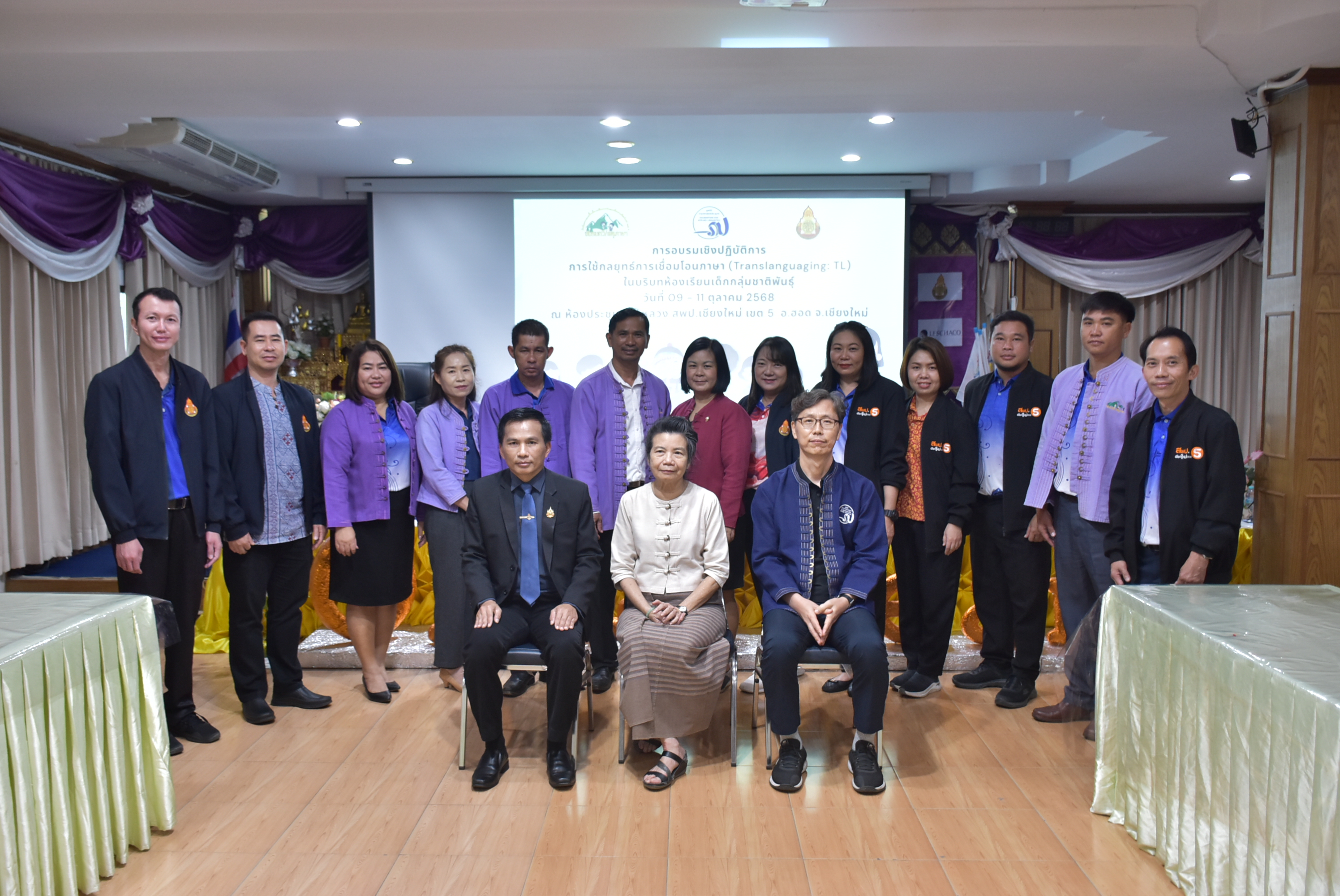 วันที่ 9 ตุลาคม 2568 นายประจักษ์ สระแก้ว ผู้อำนวยการสำนักงานเขตพื้นที่การศึกษาประถมศึกษาเชียงใหม่ เขต 5 มอบหมายให้ นายพงศ์ธร จิตรแม้น รองผู้อำนวยการสำนักงานเขตพื้นที่การศึกษาประถมศึกษาเชียงใหม่ เขต 5 เป็นประธานในพิธีเปิด การอบรมเชิงปฏิบัติการ การใช้กลยุทธ์การเชื่อมโอนภาษา (Translanguaging : TL) ในการจัดการเรียนการสอน และการอบรมจัดทำหลักสูตรสถานศึกษา ระหว่างวันที่ 9-11 ตุลาคม 2568 ซึ่งได้รับการสนับสนุนจากมูลนิธิภาษาศาสตร์ประยุกต์ โดยมี นายพศิน ใบศล ผู้อำนวยการโรงเรียนบ้านมูเซอ เป็นผู้กล่าวรายงาน การอบรมมีวัตถุประสงค์เพื่อให้ผู้มีส่วนเกี่ยวข้องทุกระดับ ได้เข้าใจถึงกระบวนการจัดการเรียนการสอนที่ต้องคำนึงถึงศักยภาพทางภาษาที่หลากหลายของผู้เรียน และเพื่อพัฒนาหลักสูตรสถานศึกษาของโรงเรียนที่ใช้นวัตกรรม ทวิ/พหุภาษาโดยใช้ภาษาแม่เป็นฐาน มีคณะครูจากโรงเรียนจำนวน 6 แห่ง เข้าร่วมการอบรม ได้แก่ โรงเรียนบ้านมูเซอ, โรงเรียนบ้านสบลาน, โรงเรียนบ้านพุย, โรงเรียนบ้านห้วยน้ำขาว, โรงเรียนบ้านขุนแม่ตื่นน้อย และโรงเรียนบ้านซิแบร มีผู้เข้าร่วมรวมทั้งสิ้น 70 คน ณ ห้องประชุมออบหลวง สพป.เชียงใหม่ เขต 5
