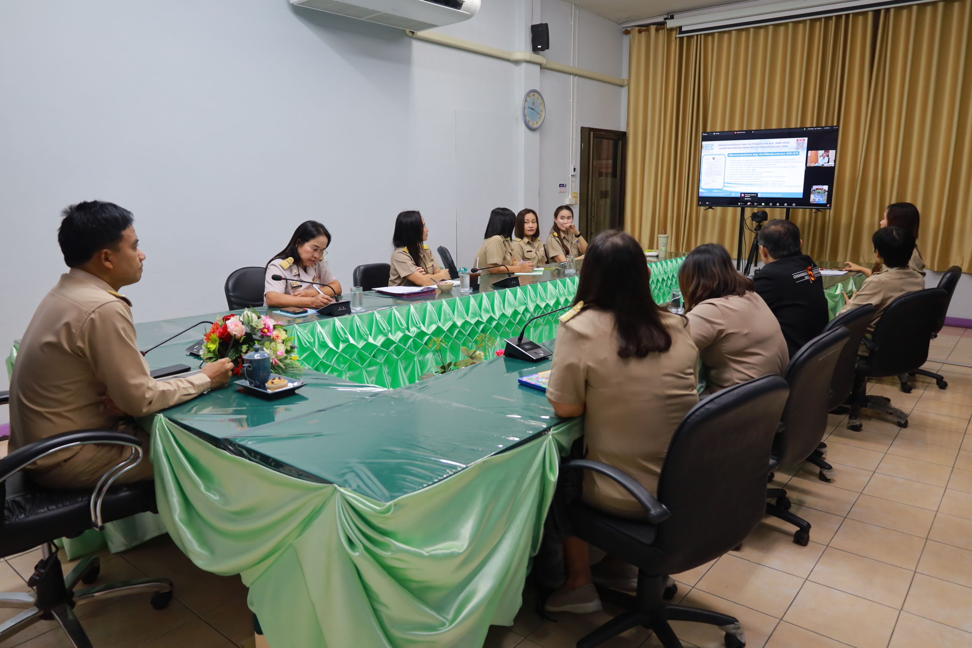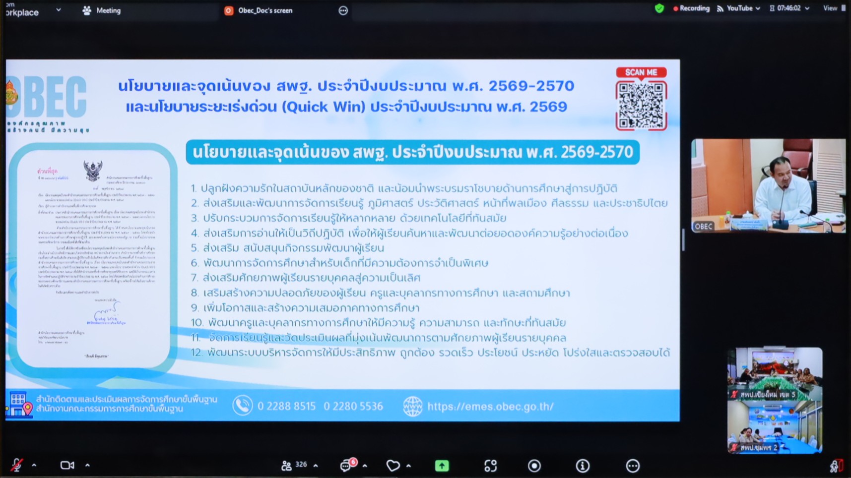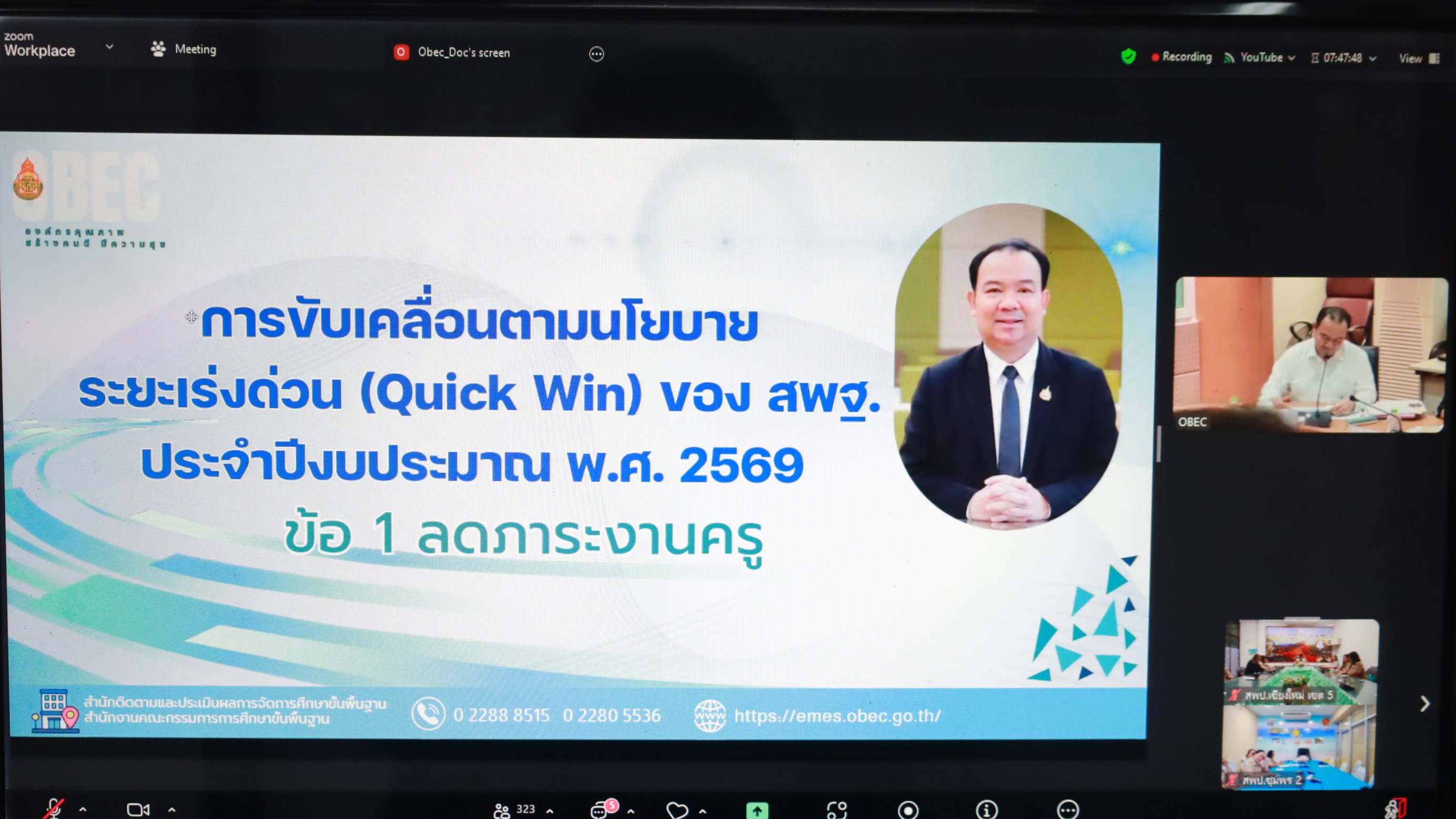 วันที่ 16 มีนาคม 2569 นายกิตติพงษ์ โปร่งเจริญ ผู้อำนวยการสำนักงานเขตพื้นที่การศึกษาประถมศึกษาเชียงใหม่ เขต 5 พร้อมด้วย นางปรานอม ยะมัง ผู้อำนวยการกลุ่มนโยบายและแผน นายพิพัฒน์ ต๊ะอุ่น ผู้อำนวยการกลุ่มกฎหมายและคดี นางสาวญากรญา ชุมภูศรี นักจัดการงานทั่วไปชำนาญการ ปฏิบัติหน้าที่ผู้อำนวยการกลุ่มอำนวยการ นางสาวลำดวน ชาติวิเศษ นักทรัพยากรบุคคลชำนาญการ ปฏิบัติหน้าที่ผู้อำนวยการกลุ่มพัฒนาครูและบุคลากรทางการศึกษา นางพิชญภัสสร์ เอี่ยมสะอาด ศึกษานิเทศก์ชำนาญการพิเศษ นางสาวปริน ปันทนันท์ นักวิเคราะห์นโยบายและแผนชำนาญการ นางวิลาวัลย์ ขันคำ นักวิเคราะห์นโยบายและแผนชำนาญการ นางสาวพานิชยา ยะมัง นักจัดการงานทั่วไปชำนาญการ นางนฤมล เดชชะ นักวิชาการเงินและบัญชีปฏิบัติการ และนางณิชนันทน์ ทรัพย์โสภิณ พนักงานราชการ ร่วมการประชุมชี้แจงแนวทางลดภาระงานครู ตามนโยบายระยะเร่งด่วน (Quick Win) ของสำนักงานคณะกรรมการการศึกษาขั้นพื้นฐาน ประจำปีงบประมาณ พ.ศ.2569 มีวัตถุประสงค์เพื่อชี้แจงแนวทางลดภาระงานครู ตามนโยบายระยะเร่งด่วน (Quick Win) สำหรับเป็นแนวทางการดำเนินงานขับเคลื่อนนโยบายเร่งด่วย ประจำปีงบประมาณ พ.ศ.2569 โดยมี นางภัทรวรรณ ภัทรบวรวุฒิ รองเลขาธิการคณะกรรมการการศึกษาขั้นพื้นฐาน เป็นประธานในการประชุม และมีนายนรินธรณ์ เซ่งล้ำ ผู้อำนวยการสำนักติดตามและประเมินผลการจัดการศึกษาขั้นพื้นฐาน กล่าวบรรยายเรื่อง การขับเคลื่อนตามนโยบายระยะเร่งด่วน (Quick Win) ของ สพฐ. ประจำปีงบประมาณ พ.ศ.2569 ในหัวข้อ การลดภาระครู ร่วมประชุมผ่านระบบออนไลน์ Zoom Meeting ณ ห้องประชุมสวนสน สพป.เชียงใหม่ เขต 5
