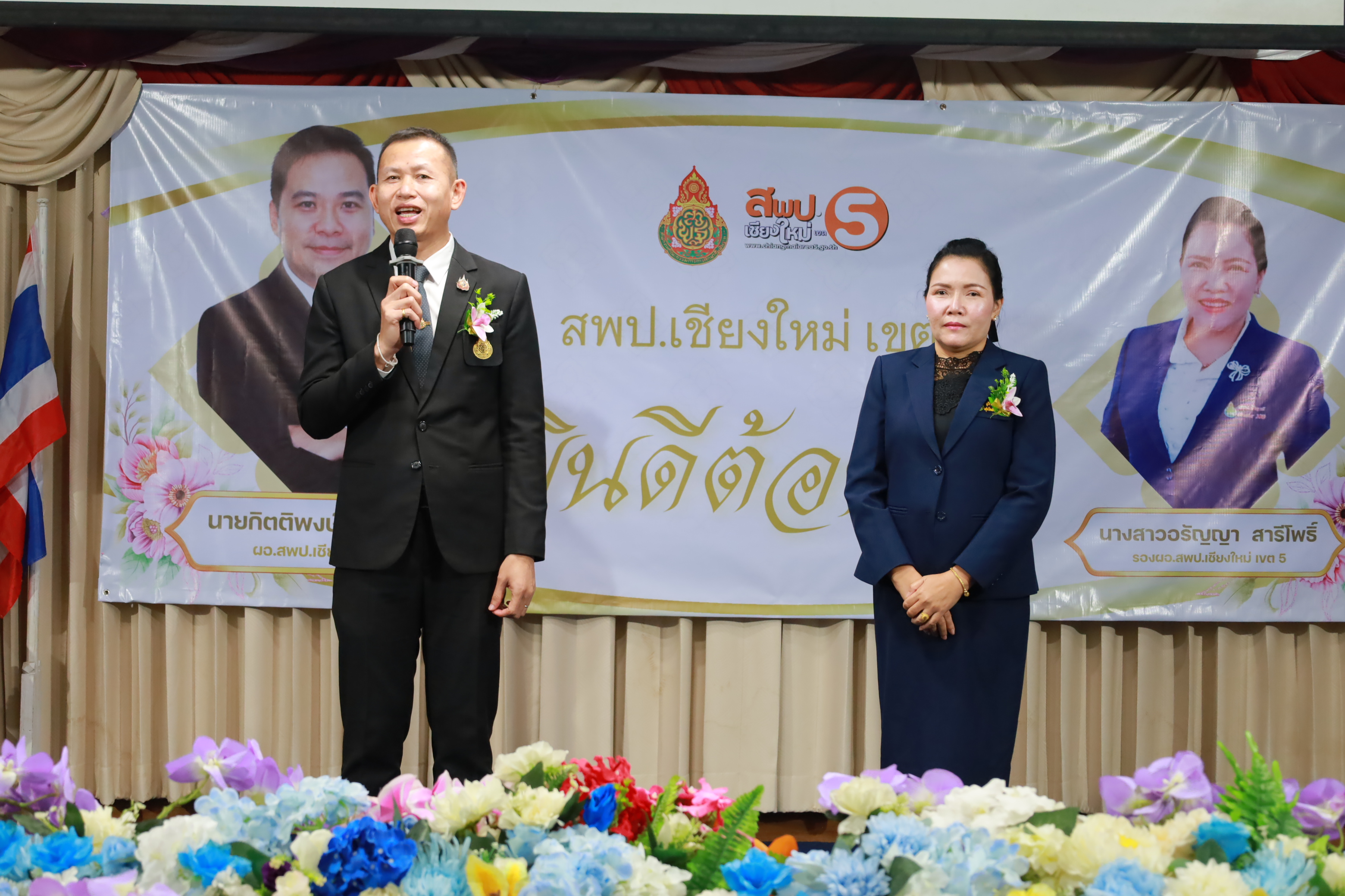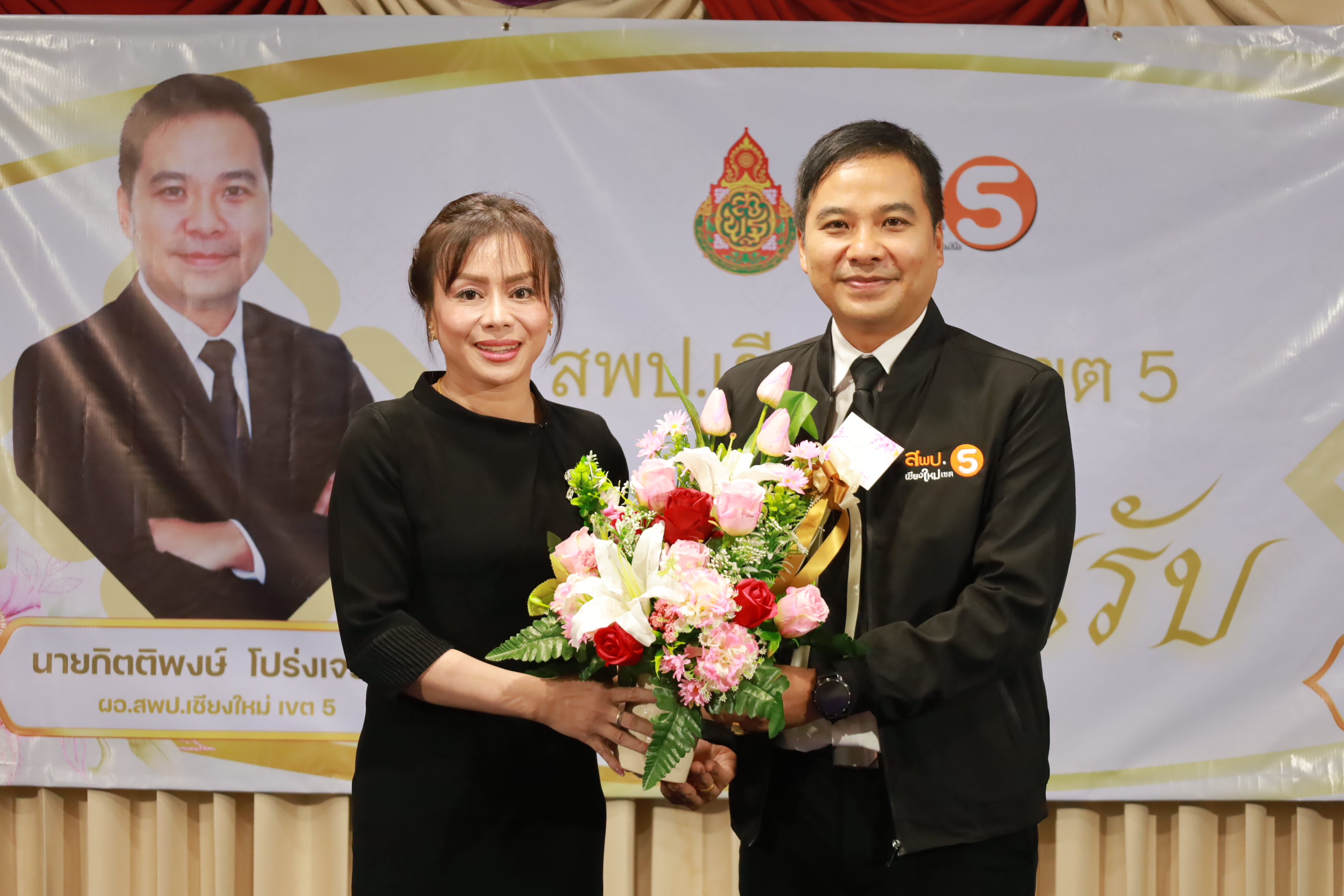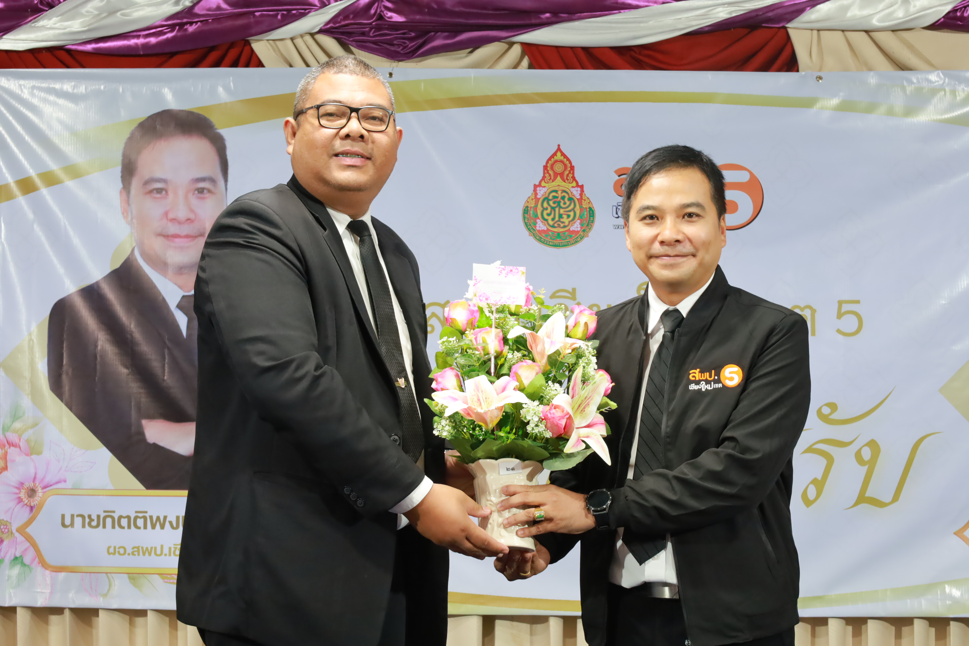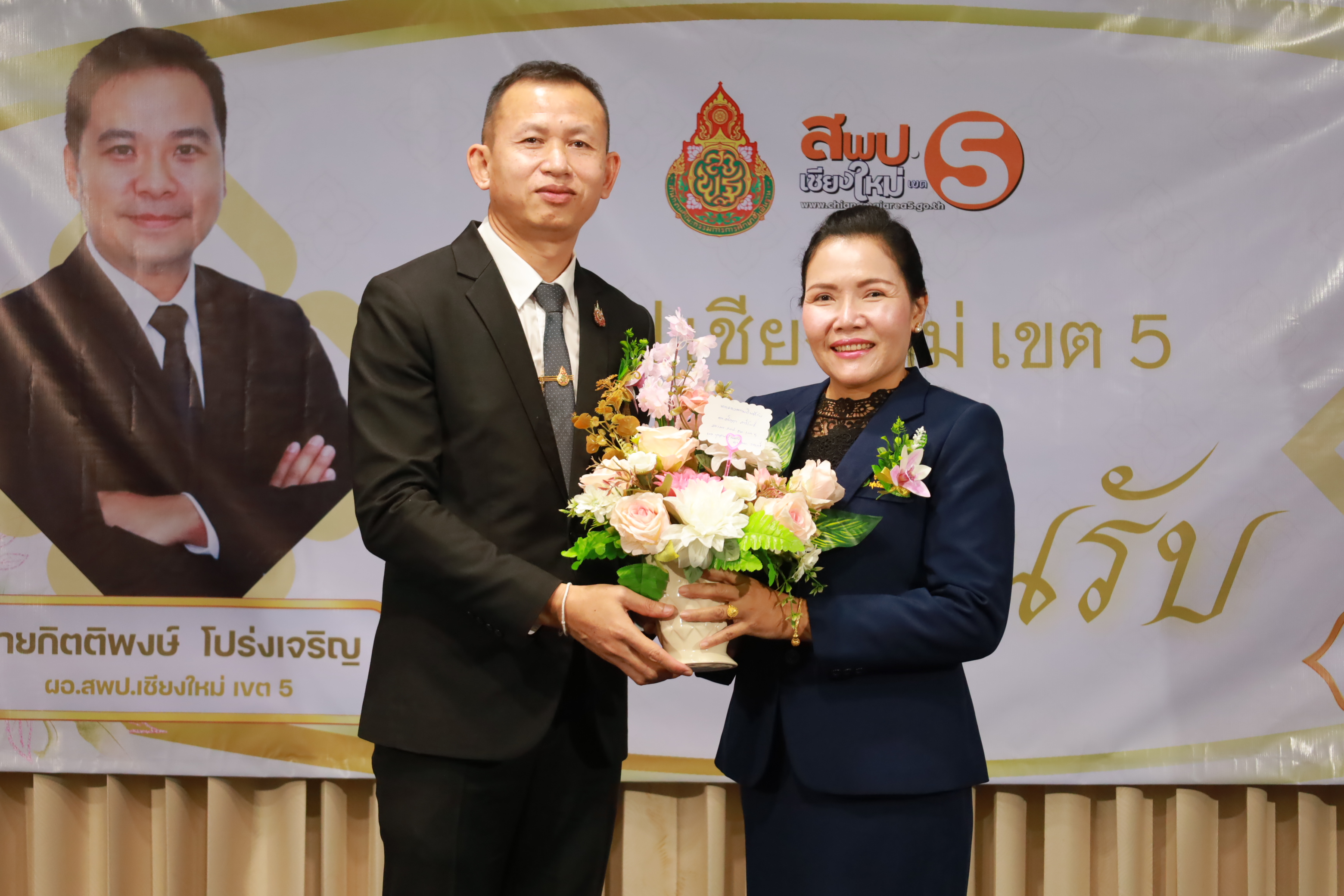 วันที่ 7 มกราคม 2569 สำนักงานเขตพื้นที่การศึกษาประถมศึกษาเชียงใหม่ เขต 5 จัดพิธีต้อนรับ นายกิตติพงษ์ โปร่งเจริญ ผู้อำนวยการสำนักงานเขตพื้นที่การศึกษาประถมศึกษาเชียงใหม่ เขต 5 และนางสาวอรัญญา สารีโพธิ์ รองผู้อำนวยการสำนักงานเขตพื้นที่การศึกษาประถมศึกษาเชียงใหม่ เขต 5 ณ สพป.เชียงใหม่ เขต 5 . มีการฟ้อนรำนำขบวนต้อนรับ โดยนักเรียนจากโรงเรียนบ้านแควมะกอก นำคณะเข้าสู่ห้องประชุม รับชมวีดิทัศน์นำเสนอสำนักงานเขตพื้นที่ ฯ และวีดิทัศน์แนะนำ ผอ.กิตติพงษ์ โปร่งเจริญ ทั้งยังได้รับเกียรติจาก ดร.ผกาภรณ์ พลายสังข์ อดีตผอ.สพป.พิษณุโลก เขต 2 และนายชัยชนะ สระทองทา ผอ.สพป.พิษณุโลก เขต 2 กล่าวแสดงความยินดี พร้อมทั้งมอบช่อดอกไม้ จากนั้นรับชมวีดิทัศน์แนะนำ รองผอ.อรัญญา สารีโพธิ์ ได้รับเกียรติจาก นายบุญถม ปุระพรม ผอ.โรงเรียนโนนคำพิทยาคม กล่าวแสดงความยินดี พร้อมมอบช่อดอกไม้ และได้รับเกียรติจาก นายอวยชัย ศรีตระกูล ประธาน อ.ก.ค.ศ.เขตพื้นที่ ฯ ขึ้นกล่าวให้การต้อนรับ ผอ.กิตติพงษ์ และรองผอ.อรัญญา พร้อมมอบช่อดอกไม้แสดงความยินดี หลังจากนั้นเป็นการมอบช่อดอกไม้แสดงความยินดีแก่ทั้งสองท่าน จากเครือข่ายพัฒนาคุณภาพการศึกษาทั้ง 11 เครือข่าย และมอบของที่ระลึกจากแขกผู้มีเกียรติที่เข้าร่วม พร้อมทั้งถ่ายภาพร่วมแสดงความยินดี