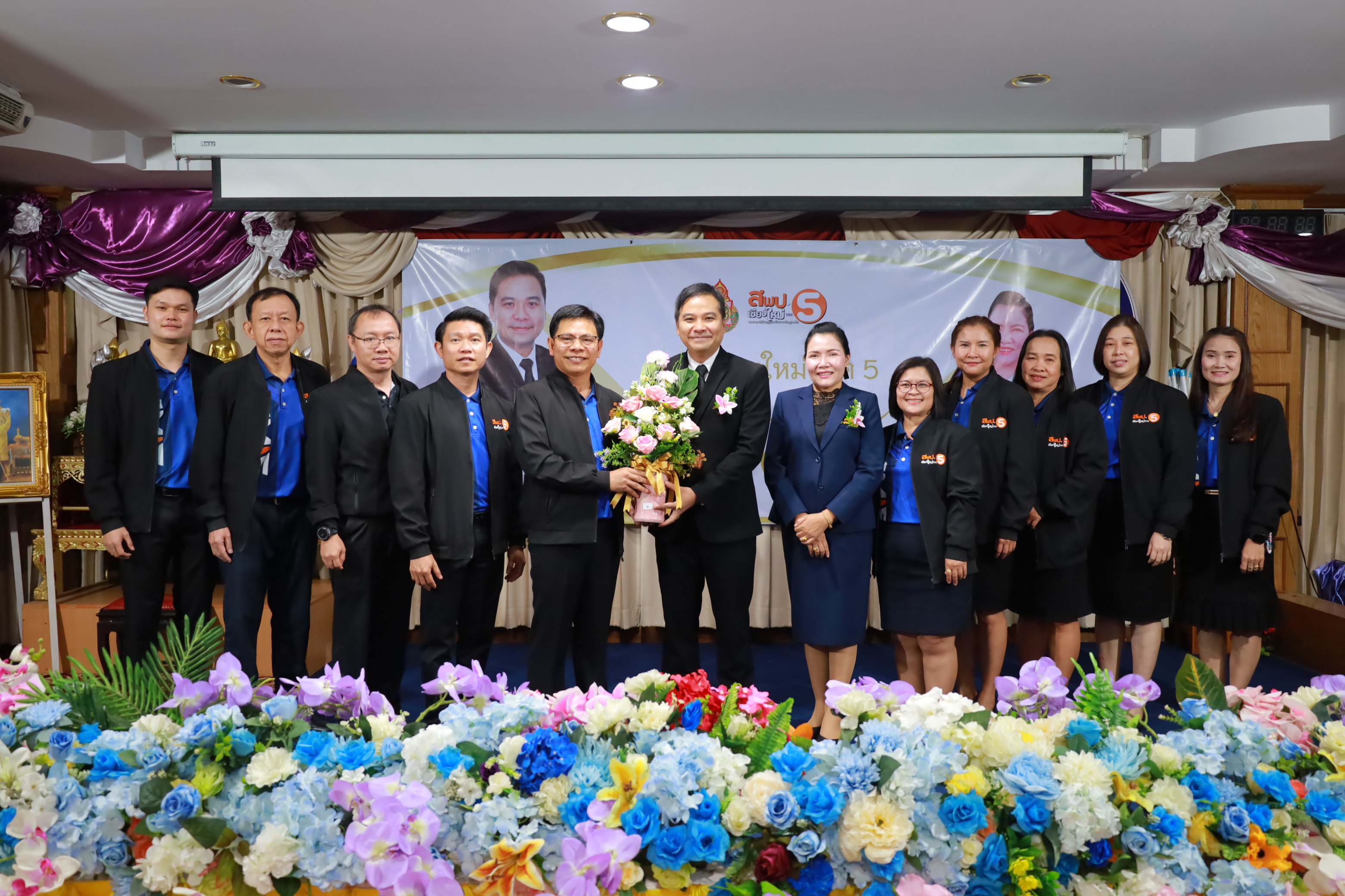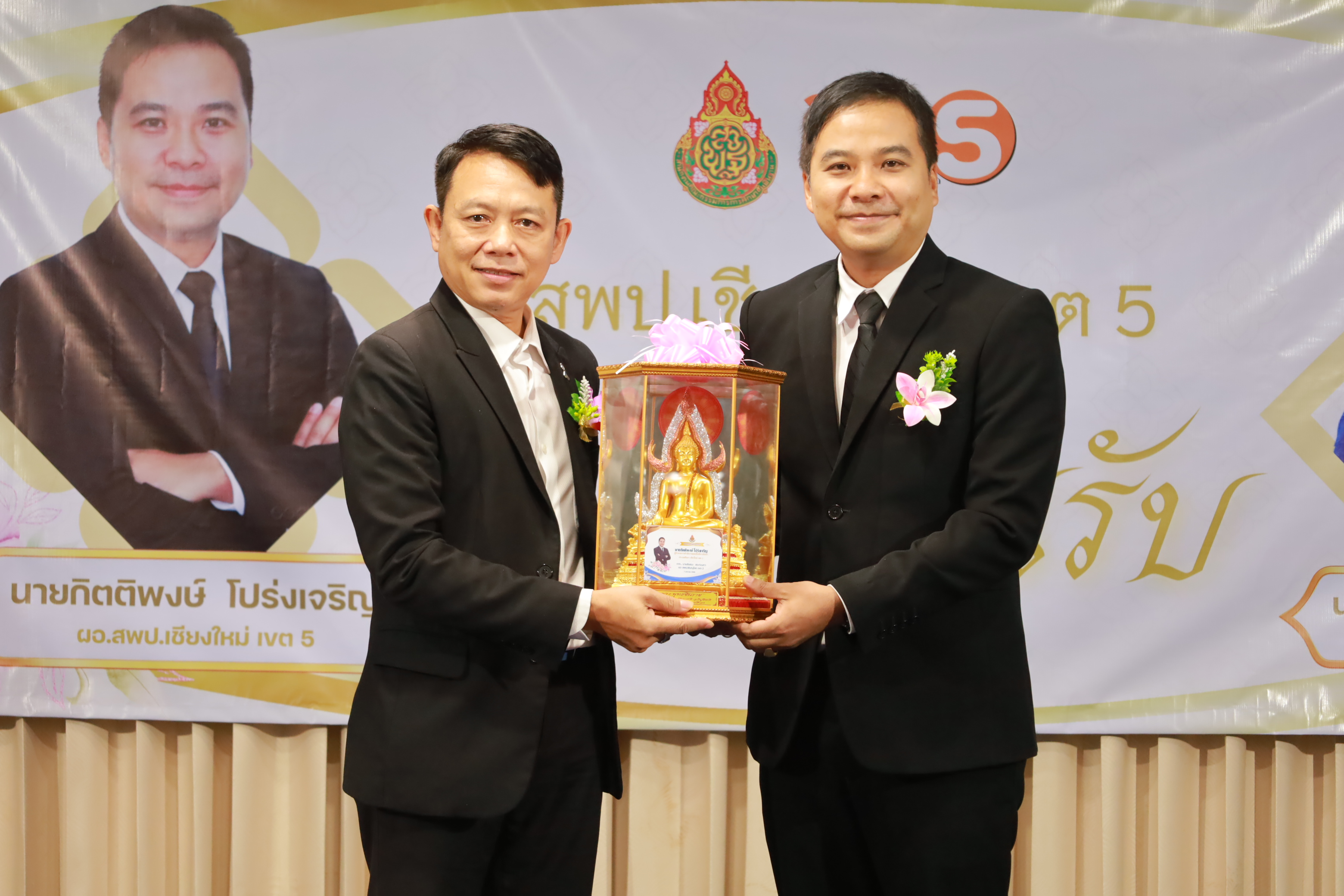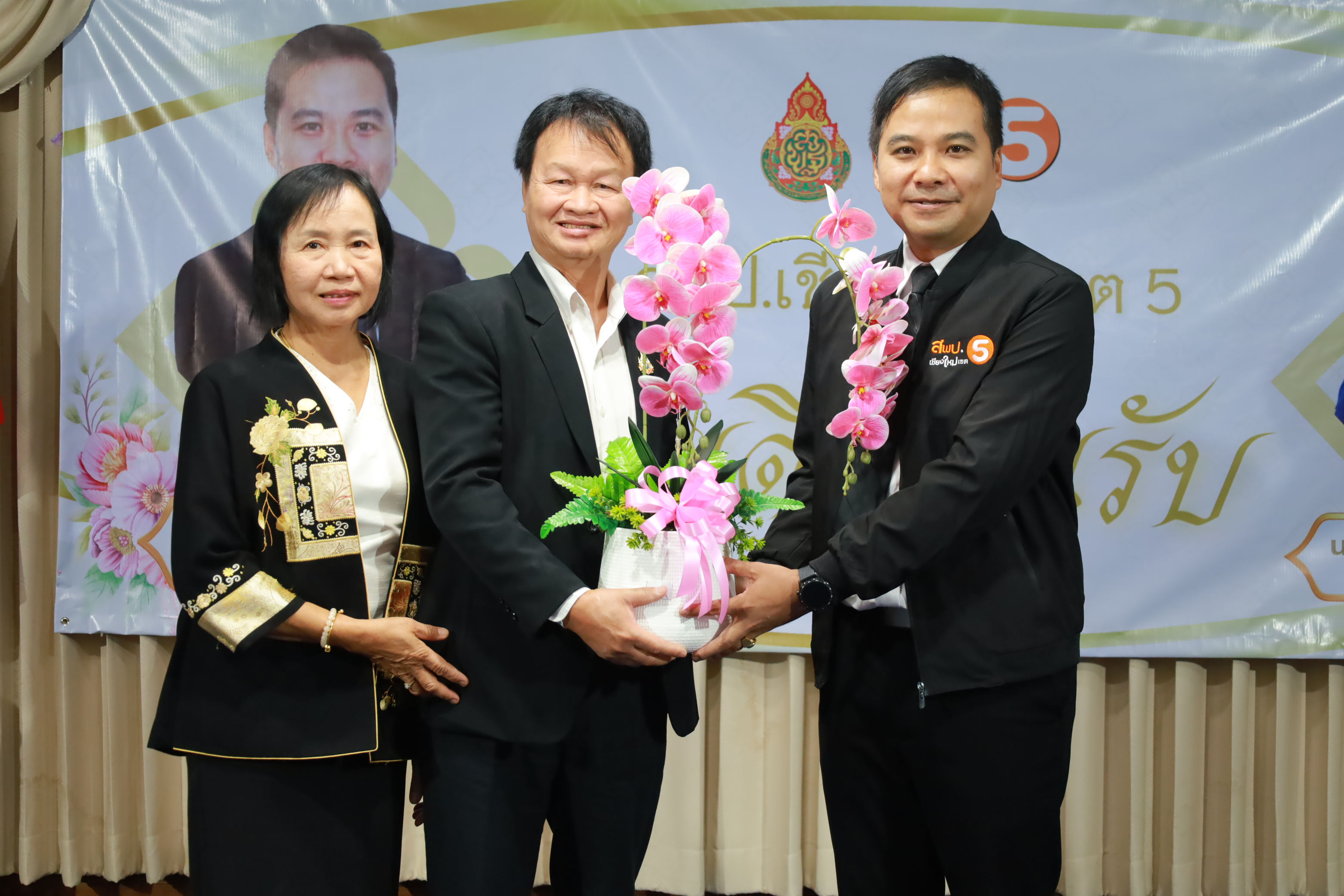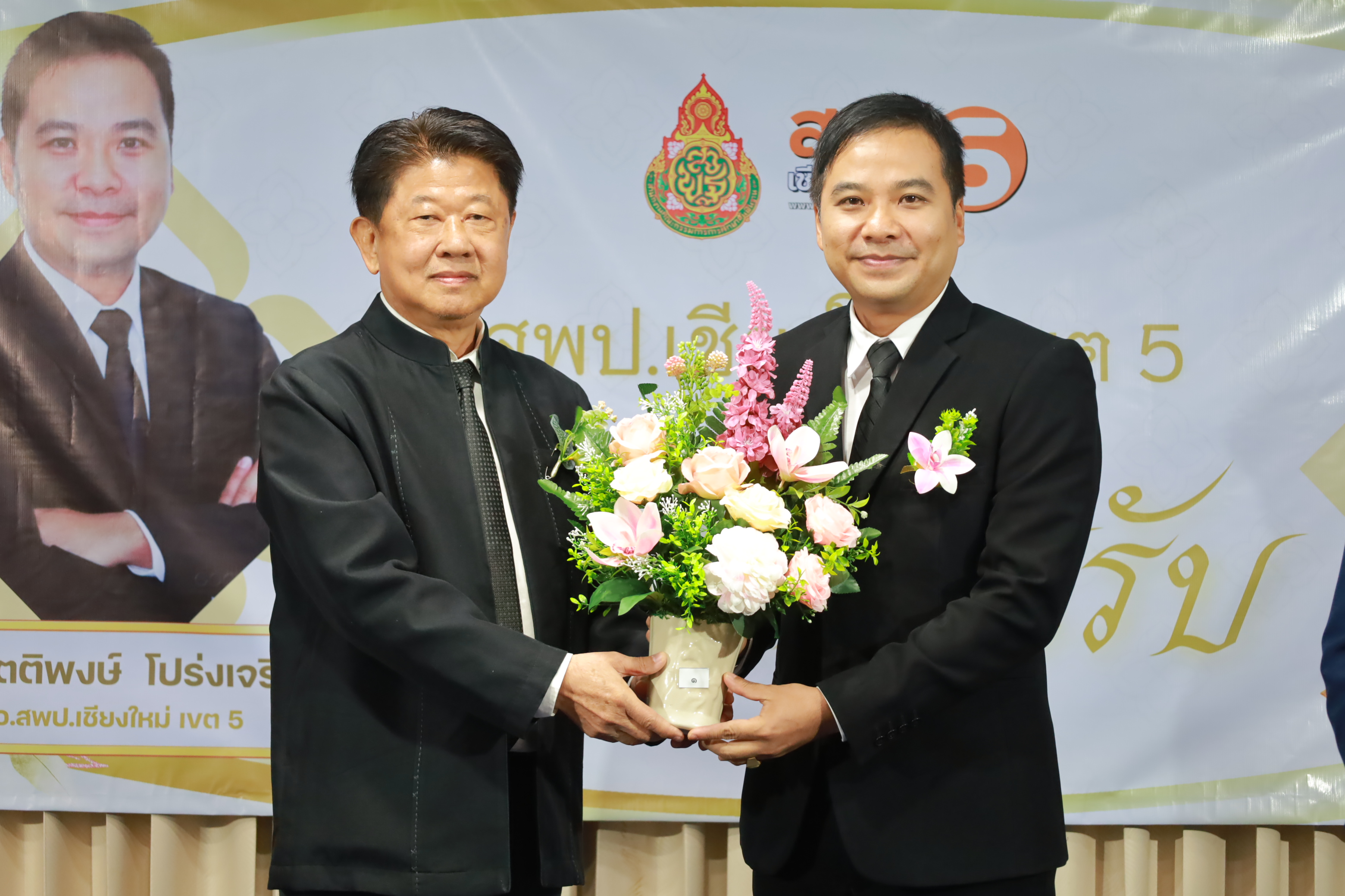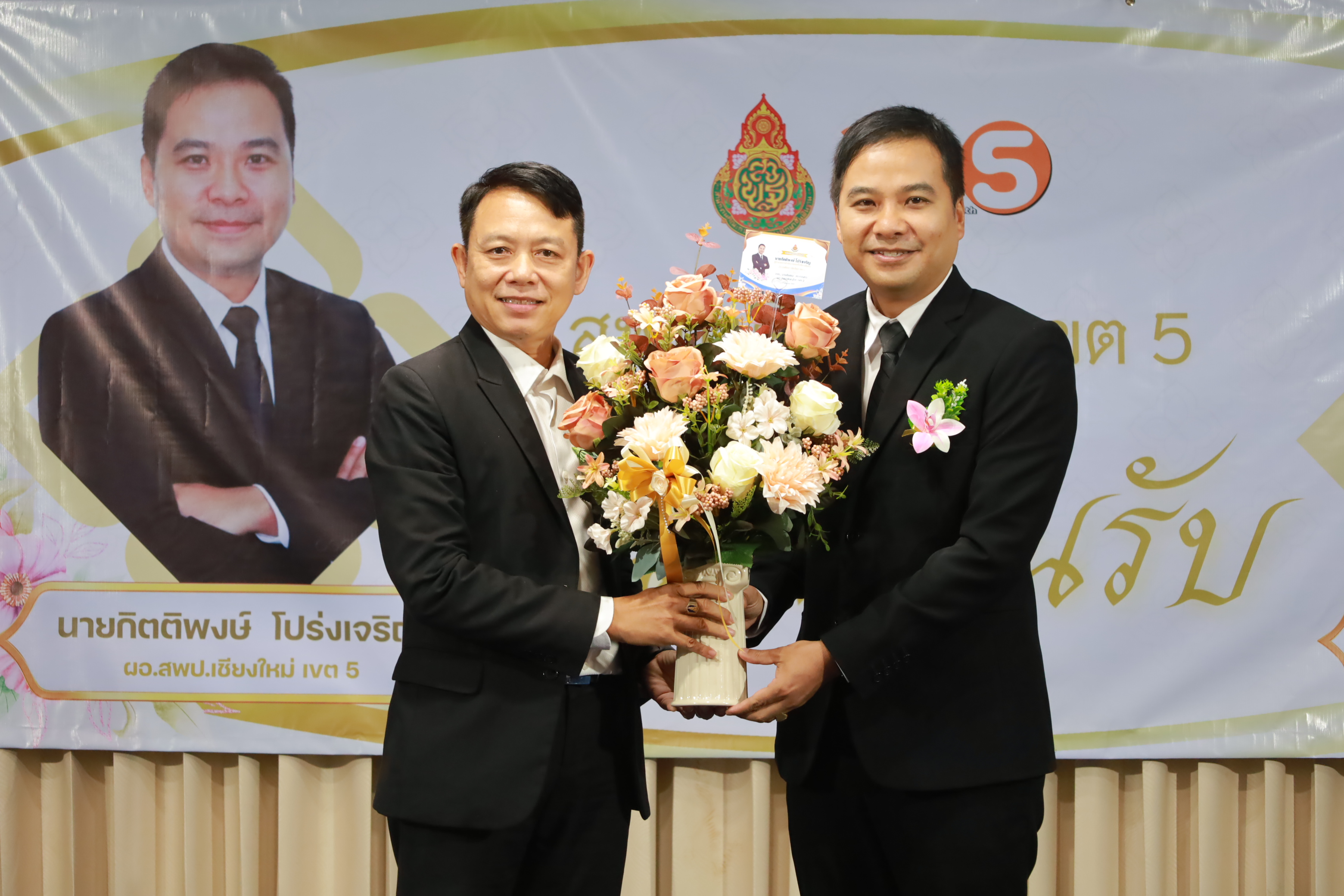 วันที่ 7 มกราคม 2569 สำนักงานเขตพื้นที่การศึกษาประถมศึกษาเชียงใหม่ เขต 5 จัดพิธีต้อนรับ นายกิตติพงษ์ โปร่งเจริญ ผู้อำนวยการสำนักงานเขตพื้นที่การศึกษาประถมศึกษาเชียงใหม่ เขต 5 และนางสาวอรัญญา สารีโพธิ์ รองผู้อำนวยการสำนักงานเขตพื้นที่การศึกษาประถมศึกษาเชียงใหม่ เขต 5 ณ สพป.เชียงใหม่ เขต 5 . มีการฟ้อนรำนำขบวนต้อนรับ โดยนักเรียนจากโรงเรียนบ้านแควมะกอก นำคณะเข้าสู่ห้องประชุม รับชมวีดิทัศน์นำเสนอสำนักงานเขตพื้นที่ ฯ และวีดิทัศน์แนะนำ ผอ.กิตติพงษ์ โปร่งเจริญ ทั้งยังได้รับเกียรติจาก ดร.ผกาภรณ์ พลายสังข์ อดีตผอ.สพป.พิษณุโลก เขต 2 และนายชัยชนะ สระทองทา ผอ.สพป.พิษณุโลก เขต 2 กล่าวแสดงความยินดี พร้อมทั้งมอบช่อดอกไม้ จากนั้นรับชมวีดิทัศน์แนะนำ รองผอ.อรัญญา สารีโพธิ์ ได้รับเกียรติจาก นายบุญถม ปุระพรม ผอ.โรงเรียนโนนคำพิทยาคม กล่าวแสดงความยินดี พร้อมมอบช่อดอกไม้ และได้รับเกียรติจาก นายอวยชัย ศรีตระกูล ประธาน อ.ก.ค.ศ.เขตพื้นที่ ฯ ขึ้นกล่าวให้การต้อนรับ ผอ.กิตติพงษ์ และรองผอ.อรัญญา พร้อมมอบช่อดอกไม้แสดงความยินดี หลังจากนั้นเป็นการมอบช่อดอกไม้แสดงความยินดีแก่ทั้งสองท่าน จากเครือข่ายพัฒนาคุณภาพการศึกษาทั้ง 11 เครือข่าย และมอบของที่ระลึกจากแขกผู้มีเกียรติที่เข้าร่วม พร้อมทั้งถ่ายภาพร่วมแสดงความยินดี