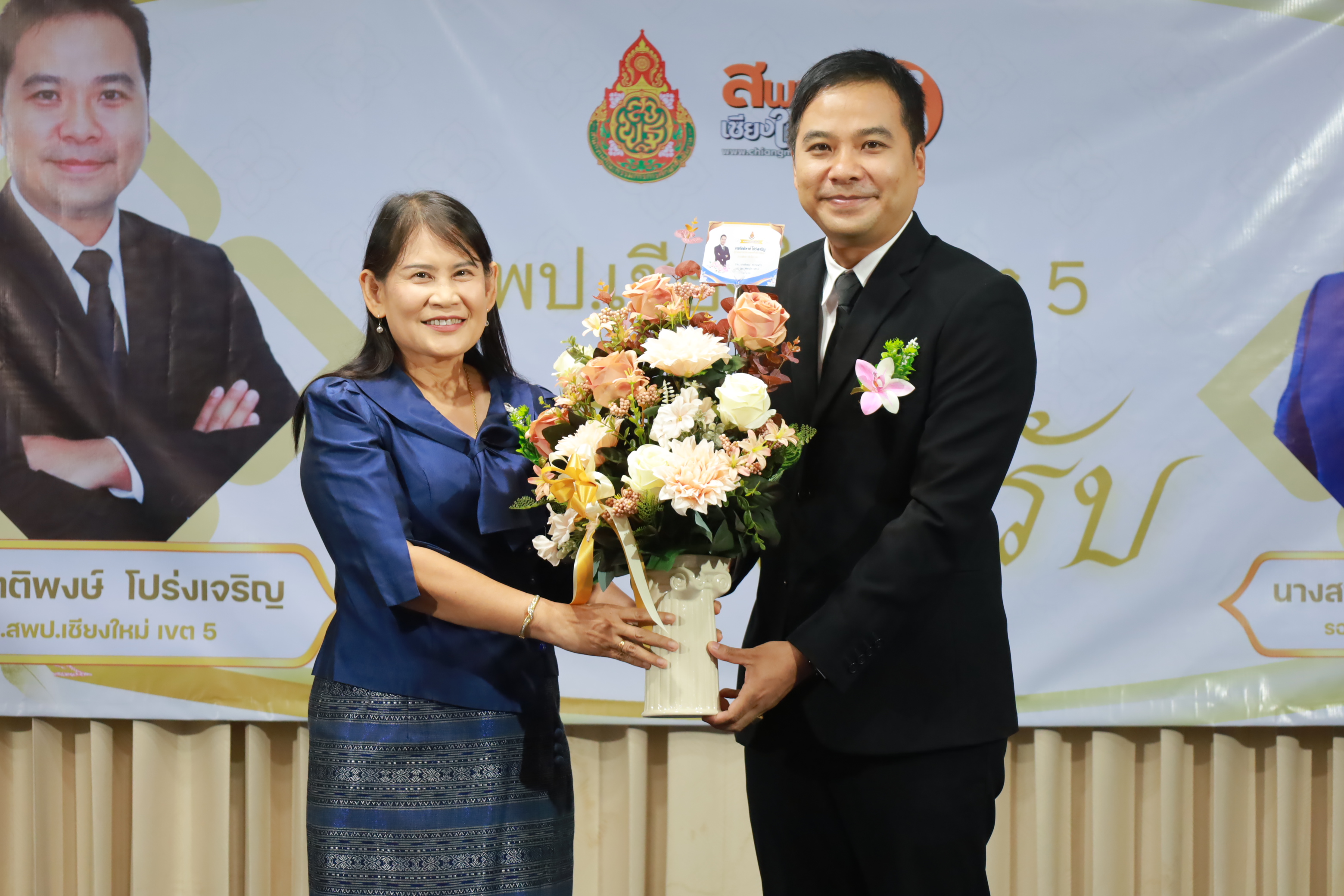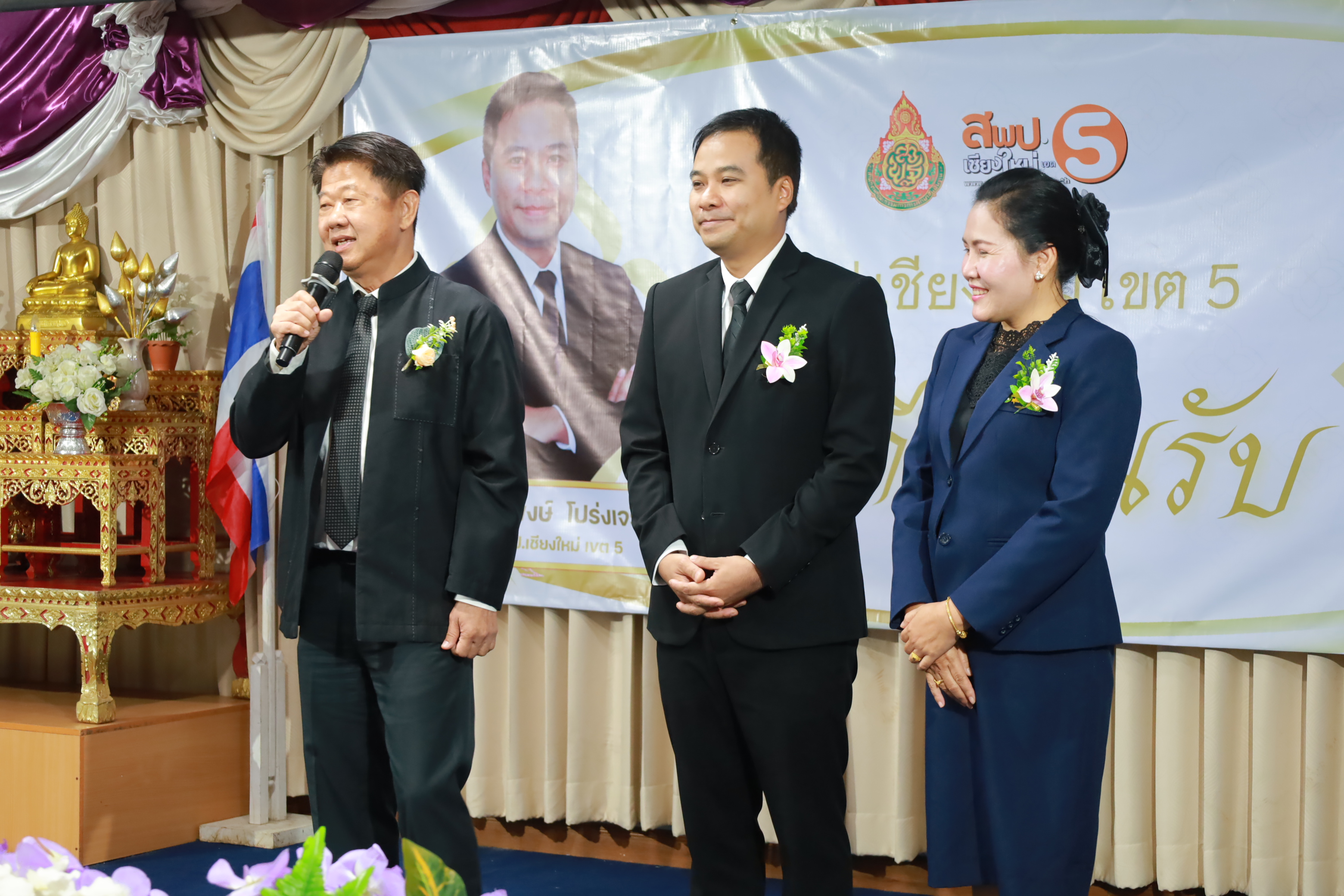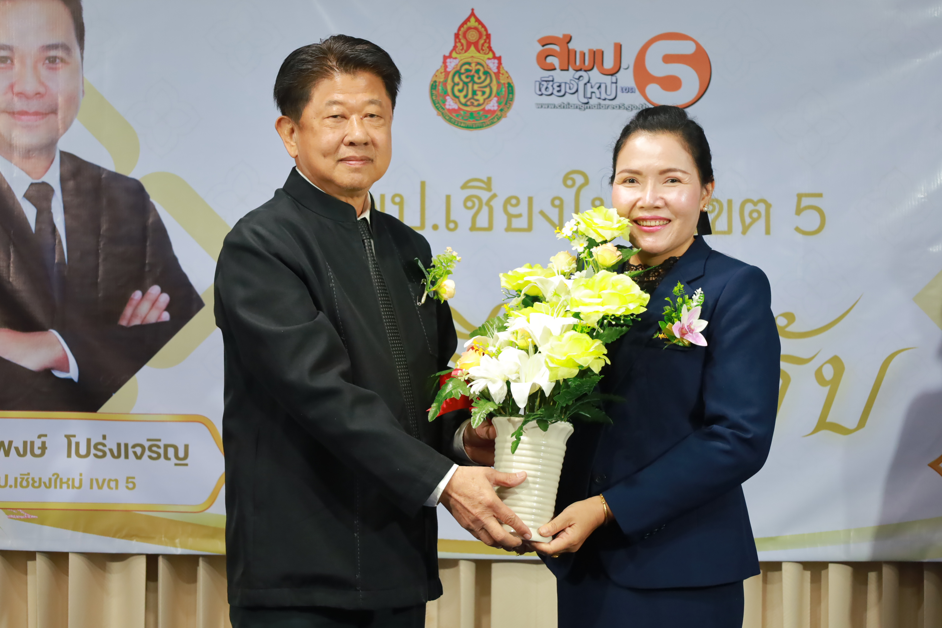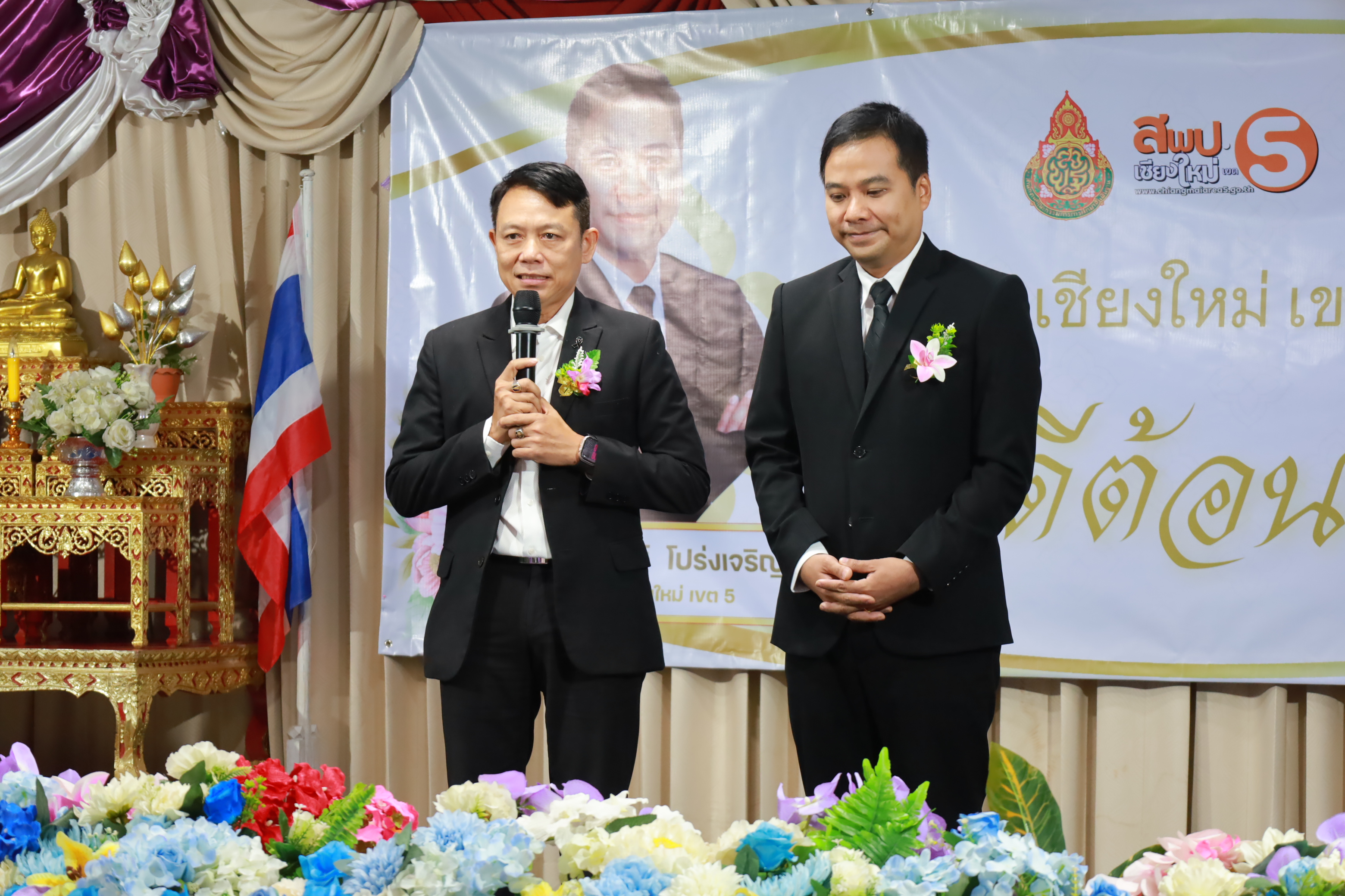 วันที่ 7 มกราคม 2569 สำนักงานเขตพื้นที่การศึกษาประถมศึกษาเชียงใหม่ เขต 5 จัดพิธีต้อนรับ นายกิตติพงษ์ โปร่งเจริญ ผู้อำนวยการสำนักงานเขตพื้นที่การศึกษาประถมศึกษาเชียงใหม่ เขต 5 และนางสาวอรัญญา สารีโพธิ์ รองผู้อำนวยการสำนักงานเขตพื้นที่การศึกษาประถมศึกษาเชียงใหม่ เขต 5 ณ สพป.เชียงใหม่ เขต 5 . มีการฟ้อนรำนำขบวนต้อนรับ โดยนักเรียนจากโรงเรียนบ้านแควมะกอก นำคณะเข้าสู่ห้องประชุม รับชมวีดิทัศน์นำเสนอสำนักงานเขตพื้นที่ ฯ และวีดิทัศน์แนะนำ ผอ.กิตติพงษ์ โปร่งเจริญ ทั้งยังได้รับเกียรติจาก ดร.ผกาภรณ์ พลายสังข์ อดีตผอ.สพป.พิษณุโลก เขต 2 และนายชัยชนะ สระทองทา ผอ.สพป.พิษณุโลก เขต 2 กล่าวแสดงความยินดี พร้อมทั้งมอบช่อดอกไม้ จากนั้นรับชมวีดิทัศน์แนะนำ รองผอ.อรัญญา สารีโพธิ์ ได้รับเกียรติจาก นายบุญถม ปุระพรม ผอ.โรงเรียนโนนคำพิทยาคม กล่าวแสดงความยินดี พร้อมมอบช่อดอกไม้ และได้รับเกียรติจาก นายอวยชัย ศรีตระกูล ประธาน อ.ก.ค.ศ.เขตพื้นที่ ฯ ขึ้นกล่าวให้การต้อนรับ ผอ.กิตติพงษ์ และรองผอ.อรัญญา พร้อมมอบช่อดอกไม้แสดงความยินดี หลังจากนั้นเป็นการมอบช่อดอกไม้แสดงความยินดีแก่ทั้งสองท่าน จากเครือข่ายพัฒนาคุณภาพการศึกษาทั้ง 11 เครือข่าย และมอบของที่ระลึกจากแขกผู้มีเกียรติที่เข้าร่วม พร้อมทั้งถ่ายภาพร่วมแสดงความยินดี